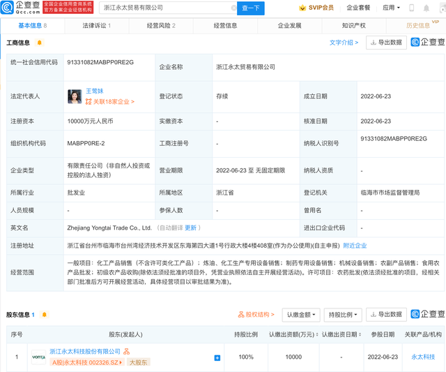 6月23日,浙江永太贸易有限公司成立,法定代表人为王莺妹,注册资本1亿元人民币,经营范围包含:炼油、化工生产专用设备销售;制药专用设备销售;初级农产品收购;农药批发等。企查查股权穿透显示,该公司由永太科技(002326)100%控股。