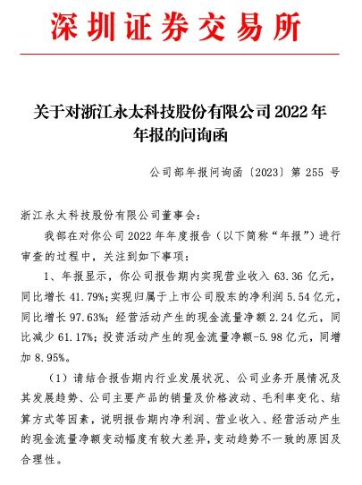 6月5日,浙江永太科技股份有限公司(以下简称“永太科技”或“公司”)收到深圳证券交易所关于2022年年报的问询函。问询函要求永太科技结合报告期内行业发展状况、公司业务开展情况及其发展趋势、公司主要产品的销量及价格波动、毛利率变化、结算方式等因素,说明报告期内净利润、营业收入、经营活动产生的现金流量净额变动幅度有较大差异,变动趋势不一致的原因及合理性等。
