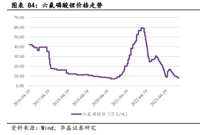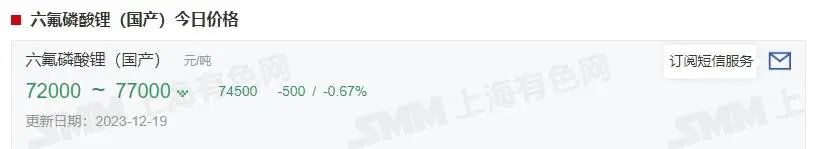 多重因素影响之下,2022年第二季度开始,六氟磷酸锂的价格开始下行。据上海有色网数据,2023年12月19日六氟磷酸锂每吨的价格为7.2-7.7万,与最高点的60万/吨相比六氟磷酸锂价格下跌幅度超80%。