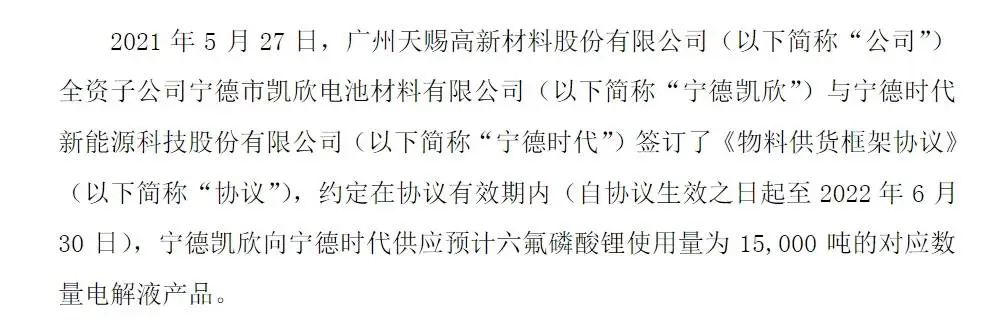 彼时,比亚迪( 002594.SZ)曾向多氟多(002407.SZ)采购不低于5.6万吨六氟磷酸锂产品;宁德时代向天赐材料( 002709.SZ)子公司采购六氟磷酸锂使用量为1.5万的电解液产品。