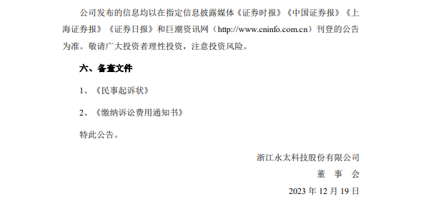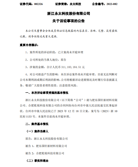 12月18日,永太科技发布公告称:就与肥东国轩新材料有限公司、合肥乾锐科技有限公司的合同纠纷向台州市中级人民法院递交民事起诉状。台州市中级人民法院已于 2023 年 12 月 18 日立案。本案件目前尚未开庭审理。