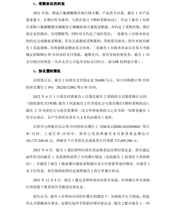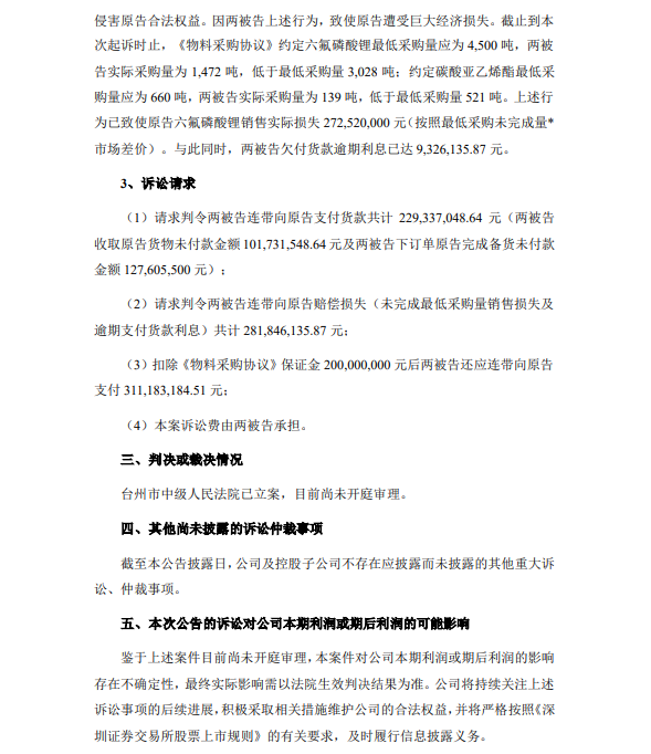永太科技同时表示:截止到本次起诉时止,《物料采购协议》约定六氟磷酸锂最低采购量应为 4,500 吨,两被告实际采购量为 1,472 吨,低于最低采购量 3,028 吨;约定碳酸亚乙烯酯最低采购量应为 660 吨,两被告实际采购量为 139 吨,低于最低采购量 521 吨。上述行为已致使自身六氟磷酸锂销售实际损失 2.7252亿元(按照最低采购未完成量*市场差价)。与此同时,两被告欠付货款逾期利息已达 932.61万元。
