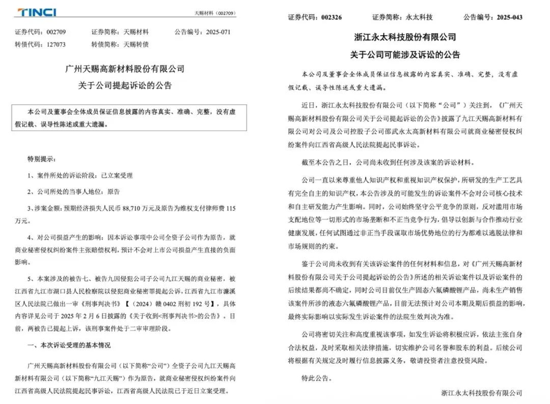7月3日晚间永太科技再次出击,公告称因名誉权纠纷起诉天赐材料。永太科技表示因广州天赐高新材料股份有限公司侵害名誉权的行为,分别向临海市人民法院和邵武市人民法院提起民事诉讼。临海市人民法院和邵武市人民法院已于2025年7月3日立案受理。涉案金额合计人民币5752万元。案件尚未开庭审理,对公司本期利润或期后利润的影响存在不确定性。