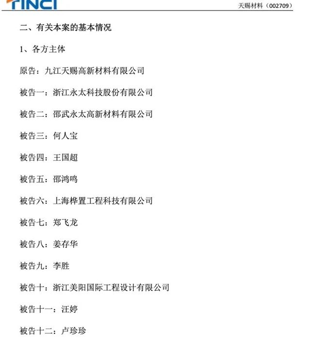 被告一浙江永太科技股份有限公司(下称:永太科技)是A股上市公司,被告二邵武永太高新材料有限公司是被告一控股子公司。2日晚间,永太科技披露《关于公司可能涉及诉讼的公告》称,截至公告之日,公司尚未收到任何涉及该案的诉讼材料。