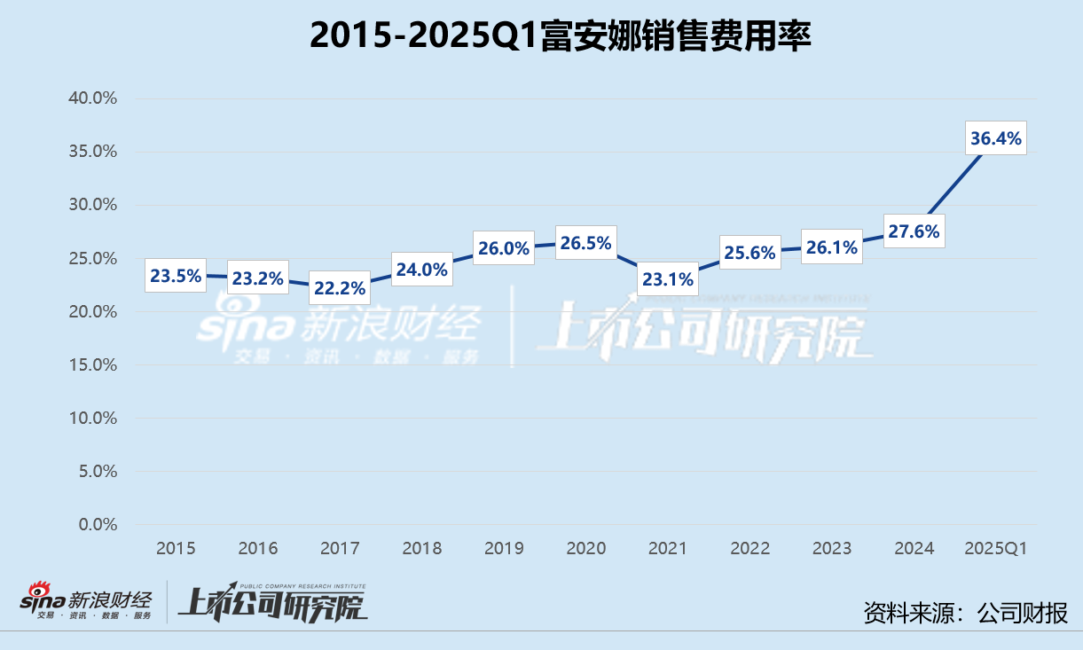 一季报显示,2025年仅前三个月,富安娜为电商平台流量推广支付的销售费用就接近2亿元,约占当期毛利润的66.8%。报告期内,公司销售费用率达36.4%,较2024年同期增长整整10个百分点。