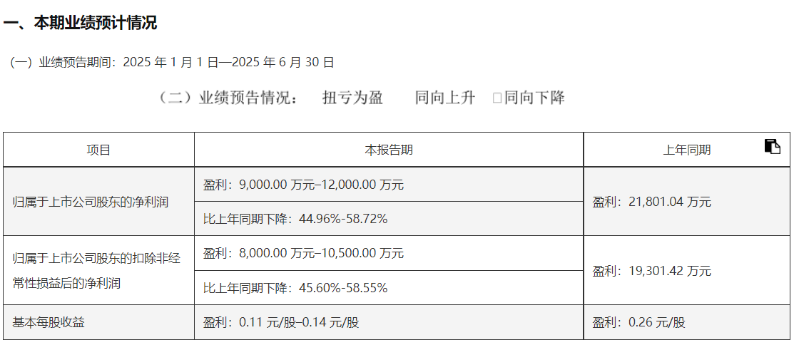 7月14日,家纺巨头富安娜发布2025年半年度业绩预告。公告显示,1-6月公司预计实现营业收入10.05亿元-11.50亿元,同比下降12.1%-19.7%;归母净利润录得9000万元-1.20亿元,较2024年同期减少44.96%-58.7%;基本每股收益约为0.11元-0.14元,而2024年上半年为0.26元/股。