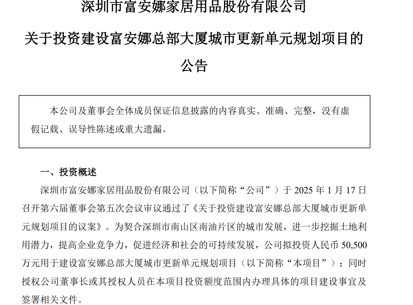 2025年1月,富安娜发布公告披露,公司计划斥资5.05亿元,在深圳南油片区打造“智慧大家居产业生态体验城”。该项目总建筑面积6万平方米将集互联网家装、智能家居、高端奢侈家具品牌及娱乐、文化、展示、体验、创意、时尚、设计于一体,为消费者提供一站式家具购物体验。