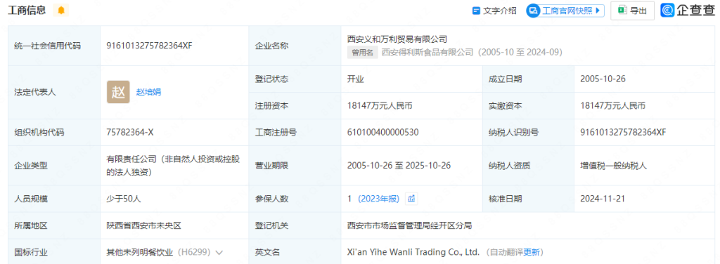 值得注意的是,西安万利商贸原来的名字叫西安得利斯食品有限公司,今年9月刚刚改名。有意思的是,4年前西安得利斯食品有限公司是被上市公司得利斯(山东得利斯食品股份有限公司)以1.33亿元的价格转让出去的。