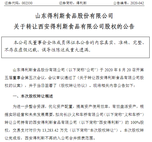 风口财经查阅得利斯的公告发现,2020年8月22日,得利斯发布公告,为进一步整合资源,优化资产配置,提高资产使用效率,有效盘活资产,根据实际经营和未来发展需要,拟向长沙义和车桥有限公司(以下简称“义和车桥”)转让公司持有的西安得利斯食品有限公司(以下简称“西安得利斯”)的100%股权,交易支付对价为13,283.42万元。本次股权转让完成后,西安得利斯不再纳入公司合并报表范围。