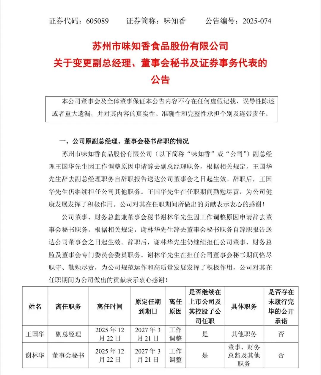 与 得利斯 引入外部高管不同, 味知香 的选择是内部提拔。新晋副总经理姚旌江2009年加入公司,历任物流经理、仓配部副总监,持有公司近20万股股份,是典型的内部成长型人才。而原副总经理王国华离任后仍在公司担任其他职务,显示出 味知香 在人事调整上的温和与延续性。