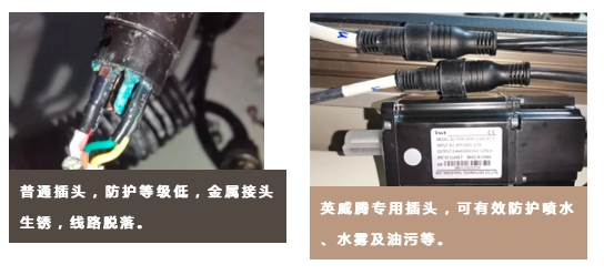 普通插头,防护等级低,金属接头生锈,线路脱落。英威腾专用插头,可有效防护喷水、水雾及油污等。