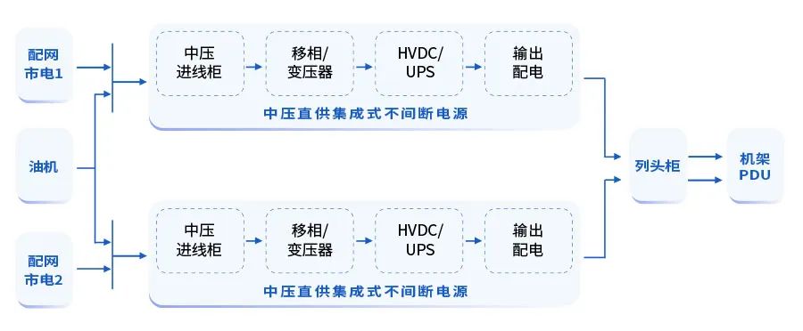 数据中心供电系统构架的核心是不间断电源系统(Uninterruptible Power System),组成该系统的主要设备以交流UPS或直流UPS(HVDC)为主。为满足数据中心不同的供电架构要求,目前业界采用不同的不间断供电构架解决方案。考虑到数据中心变配电系统建设模式存在效率低、损耗大、占地面积大、建设运维复杂和初期投资成本高等痛点,数据中心向更紧凑、占地面积更小、更高效、易部署的产品集成化方向发展,将原供电构架中的中压进线柜、变压器、不间断电源、配电集成起来,形成了数据中心“中压直供”集成式不间断电源,其原理如下图所示: