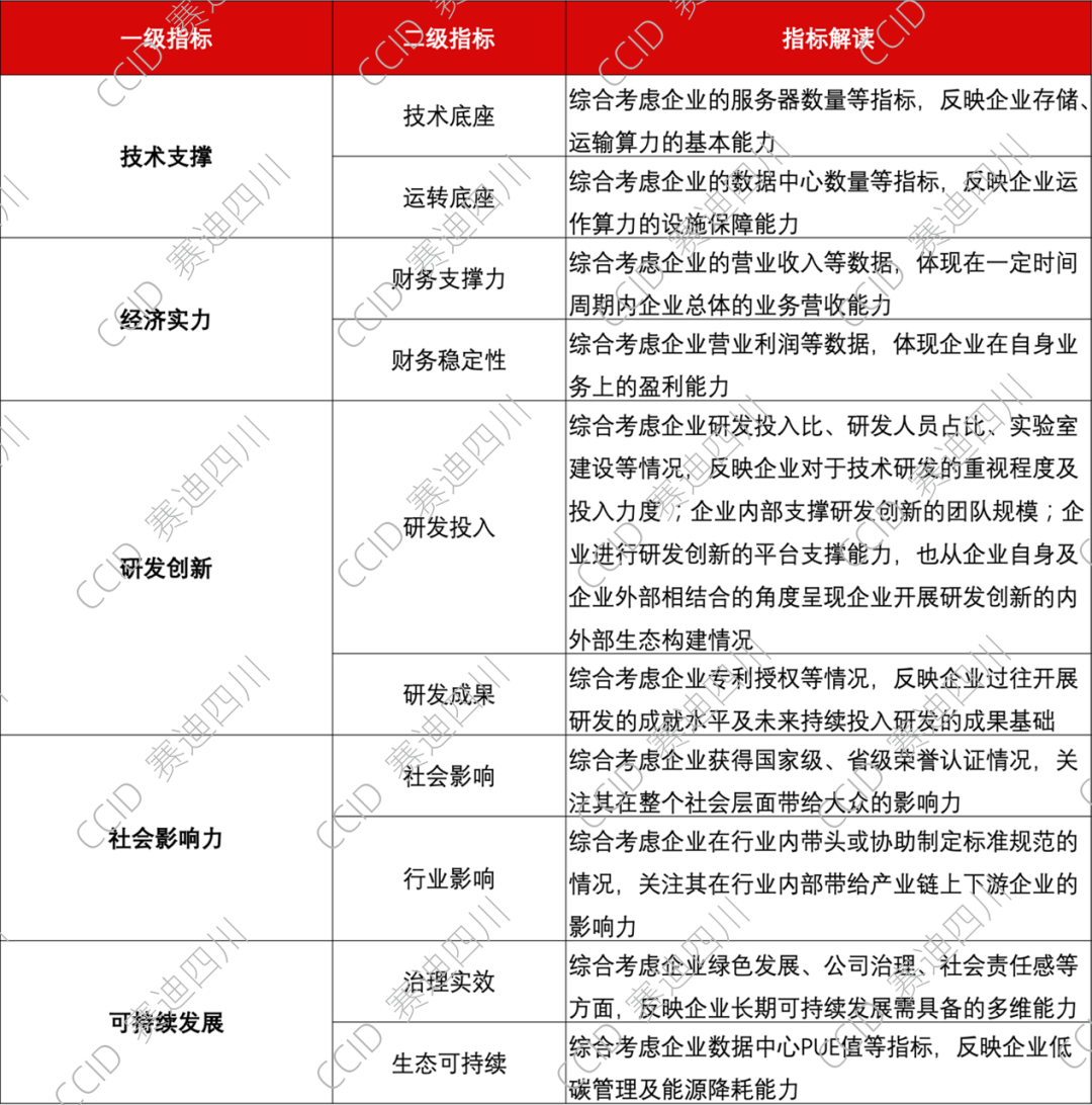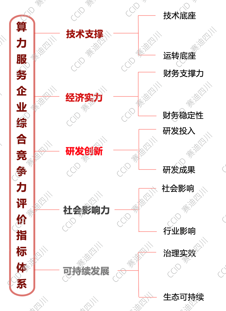 《2023—2024中国算力服务企业综合竞争力50强研究报告》对企业在算力服务领域的竞争力进行多维度评价,综合考虑企业技术支撑、经济实力、研发创新、社会影响力、可持续发展5个一级指标,技术底座、运转底座、财务支撑力、研发投入、治理实效等10个二级指标,最终形成企业在算力服务领域的综合竞争力评价指标体系,如上图所示。