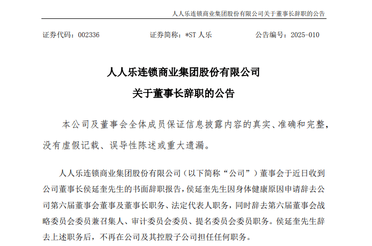 据悉,*ST人乐董事长侯延奎因个人健康问题,向公司提交了辞呈,正式辞去第六届董事会董事、董事长及法定代表人等职务。在新的董事长和法定代表人选举产生前,侯延奎将继续暂代相关职责,确保公司运营的平稳过渡。