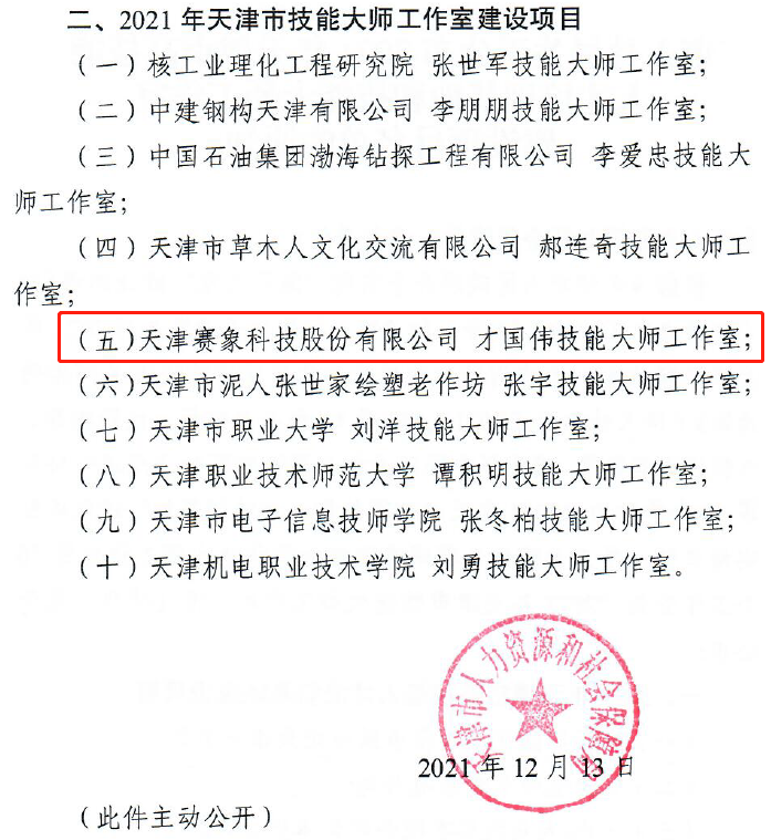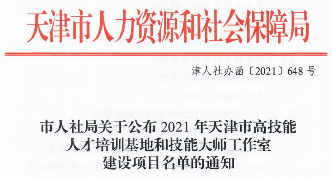 日前,经基层申报、区级推荐、市级评审等程序,天津市人力资源和社会保障局正式发布《2021年天津市高技能人才培训基地和技能大师工作室建设项目名单的通知》,确定了天津赛象科技股份有限公司的才国伟技能大师工作室等10个工作室为“2021年天津市技能大师工作室”建设项目。