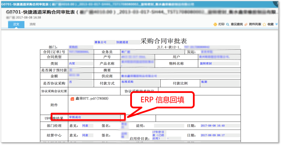 通过协同运营平台与ERP系统双向集成,使得采购合同、订单管理可以实现线上一体化操作,意味着管理人员在协同中就可以审核ERP采购订单,而在ERP中也可看到协同的审核结果。这样一种双向的数据互通,大幅提升内部事务处理效率。