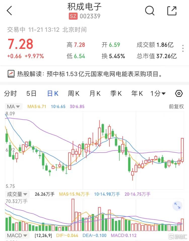 积成电子(002339.SZ)今日早盘涨停,封单逾46万手,现报7.28元,暂成交1.8亿元,最新市值37亿元。积成电子今日午间公布,国家电网有限公司于2022年11月19日在国家电网有限公司电子商务平台公告了“国家电网有限公司2022年第六十一批采购(营销项目第二次电能表(含用电信息采集)招标采购)推荐的中标候选人公示”,公司为该项目的中标候选人之一,共中5个包,中标金额共约为1.53亿元,占公司2021年营业收入的7.50%。