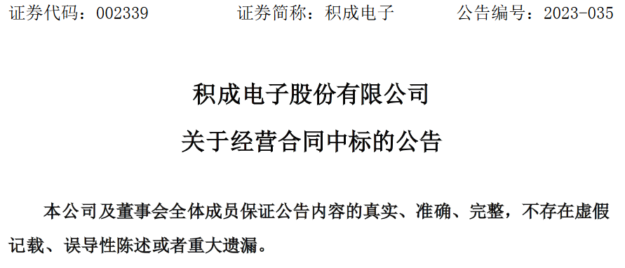 积成电子(002339)于6月7日发布公告称,积成电子股份有限公司(以下简称“公司”或“本公司”)于 2023 年 6 月 6 日收到国家电网有限公司及国网物资有限公司发来的中标通知书,确定本公司为“国家电网有限公司 2023 年第三十五批采购(营销项目第一次电能表(含用电信息采集)招标采购)”项目的中标人,共中 5 个包,中标金额合计 10,472.03万元。