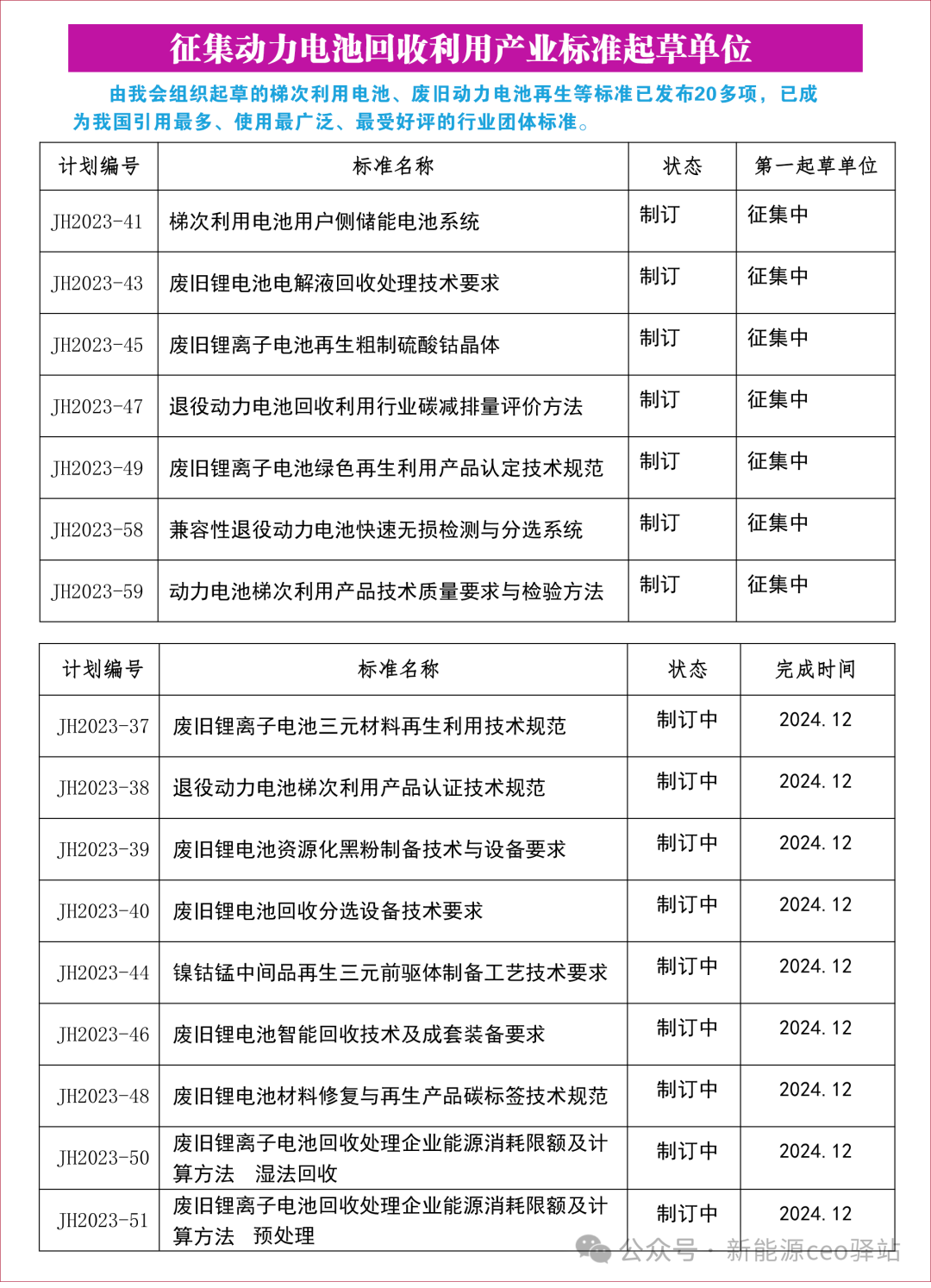 为贯彻落实《中华人民共和国标准化法》、国务院《深化标准化改革方案》、国家标准化管理委员会和民政部发布的《团体标准管理规定》(国标委联【2019】1号)等文件精神,加强行业标准体系建设,提升团体标准对市场发展的技术支撑和基础保障水平。废旧锂电池是宝贵的“城市矿山”,退役动力电池绿色再生和梯次利用是保障报废动力电池材料高效回收与循环利用的重要基础。由中国电子节能技术协会电池回收利用专业委员会组织的《废旧锂离子电池三元材料再生利用技术规范》、《废旧锂离子电池再生粗制硫酸钴晶体》等多项团体标准,现面向相关行业征集标准起草单位。