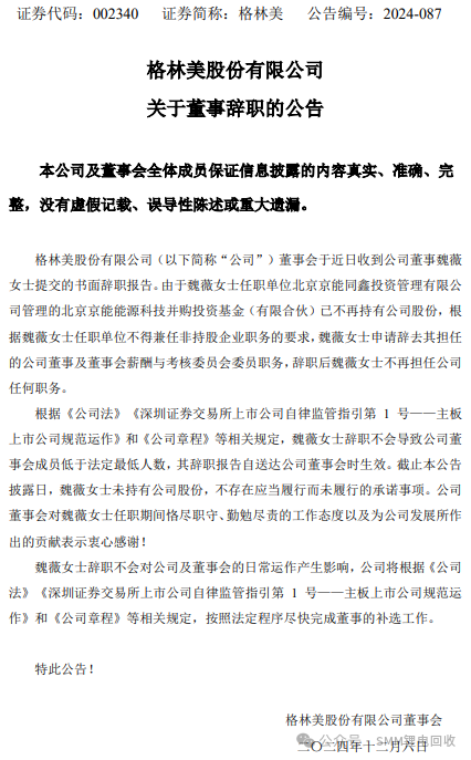 12月7日,格林美股份有限公司对外发布关于董事辞职的公告。