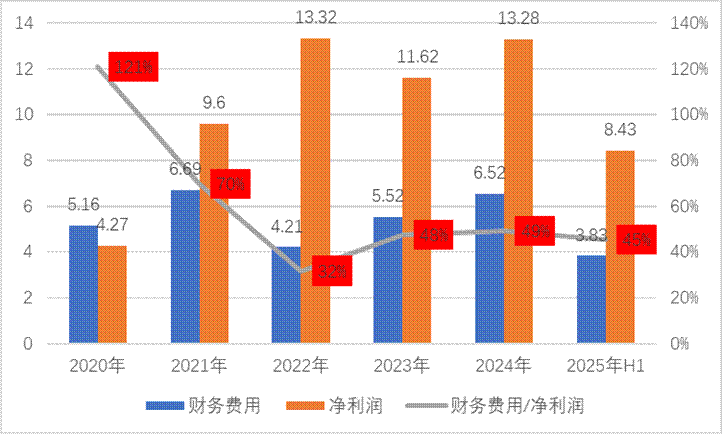 截止2025年上半年末,公司短期债务为142.94亿元,长期债务为186.86亿元,而同期货币资金(剔除受限资金)与交易性金融资产合计仅为54亿元。公司仅短期债务缺口近百亿元。Wind数据显示,公司财务费用与净利润之比,最高时超同期净利润,2024年该指标为49%,2025年上半年为45%。可以看出,公司的巨额的财务费用吞噬了部分盈利。