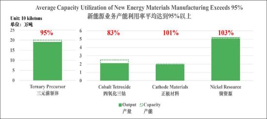 值得注意的是,2024年,格林美的新能源业务的产能利用率平均达到95%以上,远超行业产能平均利用率。其中,公司三元前驱体产能利用率为95%,四氧化三钴产能利用率为83%,正极材料为101%,镍资源为103%。