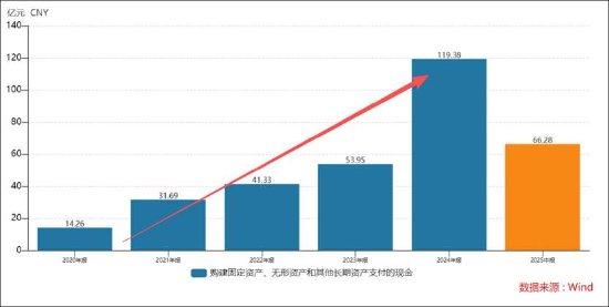 值得注意的是,公司近年在激进进行资本性扩张,资本性支出由2020年的14.26亿元飙涨至2024年的119.38亿元。2025年上半年,其资本性支出为66.28亿元。
