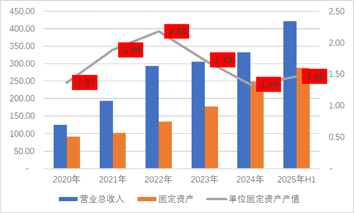 然而,尽管公司营收规模持续扩大,但是单位产值效率似乎并不佳。数据显示,2020年至2024年,公司单位固定资产产值分别为1.37、1.89、2.18、1.73、1.34。从上述数据表现看,该指标呈现出波动,且自2022年后急剧下降,即公司2022年固定资产单位产值为2.18,2024年骤降至1.34。考虑公司2024年固定资产新增情况,2025年营收一致性预期为422亿元,单位产值仅为1.46。显然,即便按照预测数预估,公司的固定资产单位产值相比2022年明显下降。
