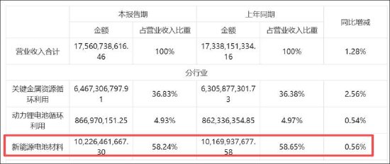 2025年半年报显示,公司实现营业收入175.61亿元,同比增长1.28%。其中新能源电池材料业务收入占比近六成,同比增速仅为0.56%。