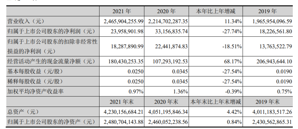 2021年,巨力索具营业收入24.66亿元,较去年同期增长11.34%;归属于上市公司股东的净利润2395.89万元,较去年同期减27.74%。