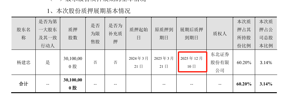 乐居财经从公告了解到,实控人杨建忠质押的30,100,000股,原本在3月21日质押到期。提前3天巨力索具发布公告,杨建忠这部分股权质押进行展期,质押到期日为今年12月10日。