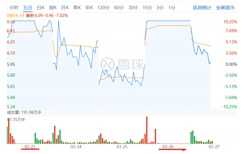 3月21日触发涨停板,3月25日触及跌停板,3月26日再度触发涨停板,为6.55元/股,涨幅10.08%。