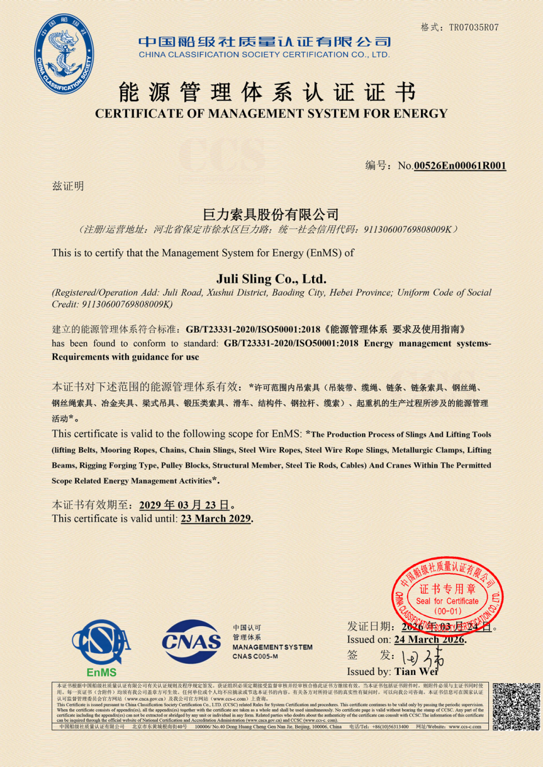 此次认证证书的获得,是对巨力索具能源管理工作成效的高度认可,更是巨力索具积极履行社会责任的重要体现。未来,巨力索具将持续深化绿色制造、精益管理,不断推动技术创新与管理提升,为绿色能源领域提供更加可靠的吊装产品与解决方案。