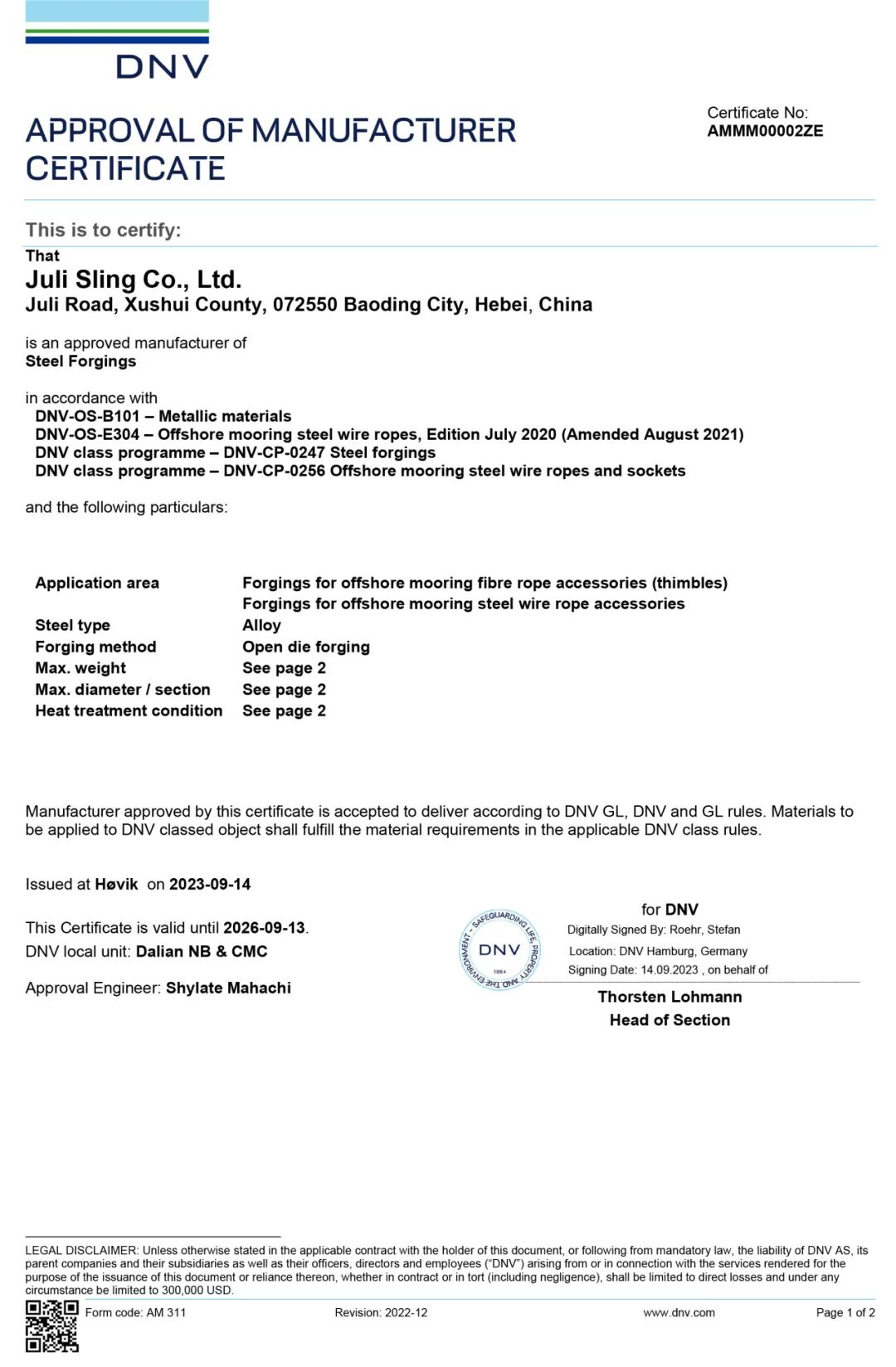 △ DNV长期系泊钢丝绳接头及缆绳套环锻件工厂认可证书