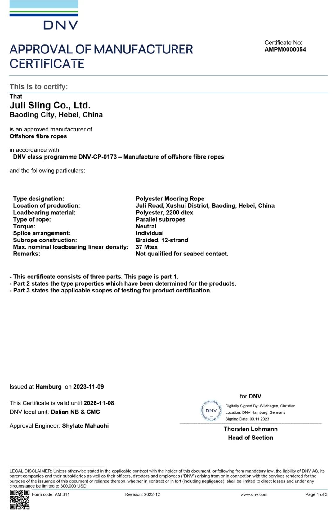 △ DNV长期系泊缆绳(涤纶)工厂认可证书