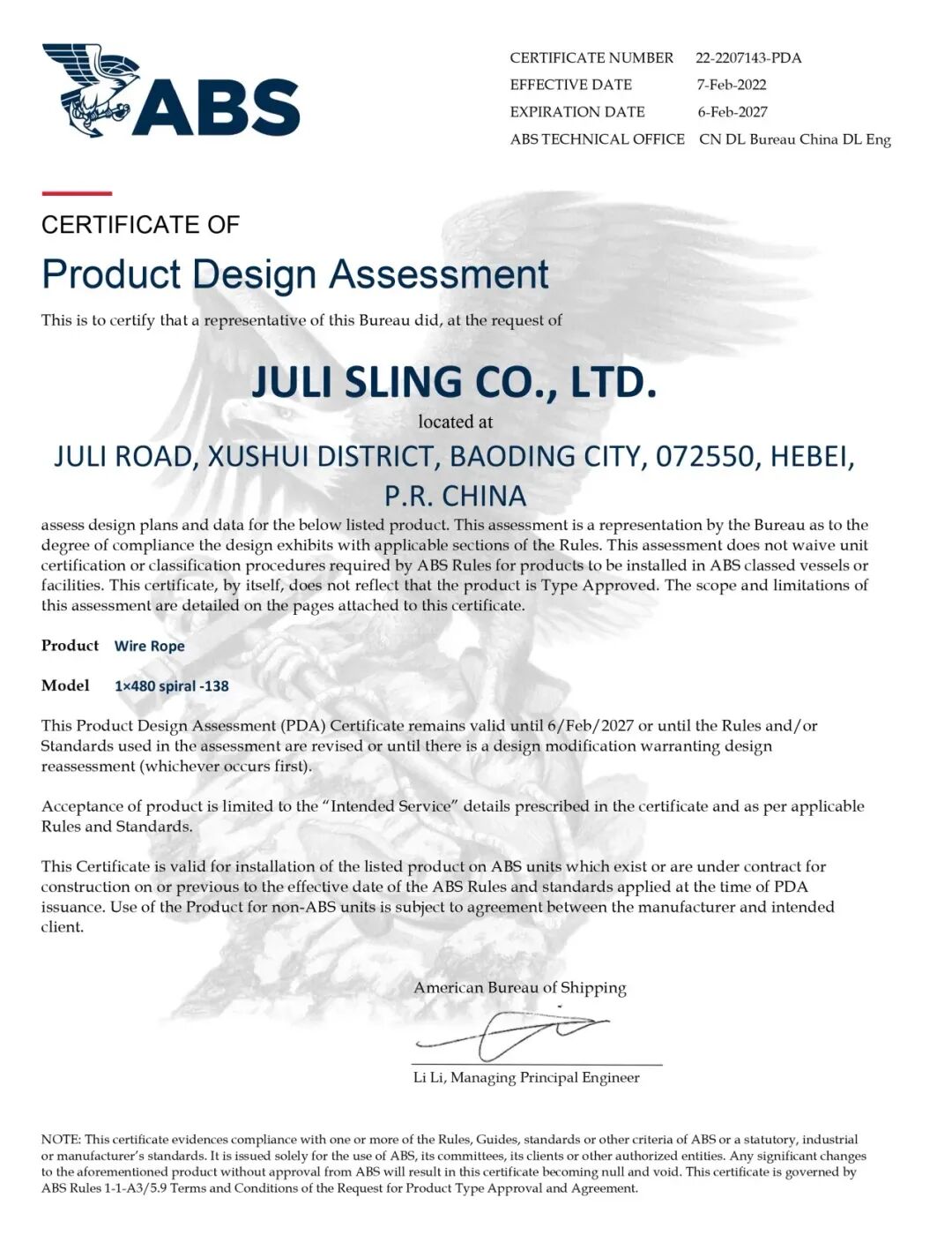 2022年,巨力索具取得美国船级社(ABS)单股钢丝绳ABS设计评估证书,这是巨力索具在深海系泊领域取得的重要资质认证之一。