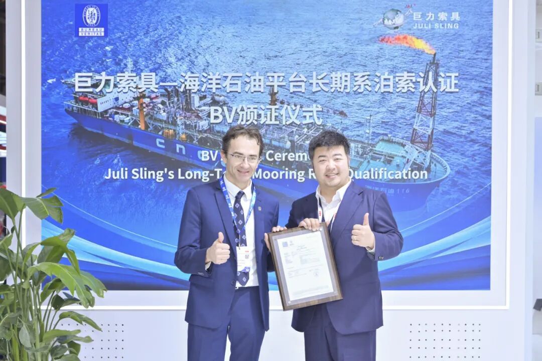 在2025中国国际海事会展期间,法国船级社(BV)向巨力索具颁发了“海洋石油平台长期系泊索”专项认证证书。这项认证是针对海洋石油平台长期系泊索这一技术门槛领域的专项认证,是对巨力索具深耕深海装备技术的最佳注脚。