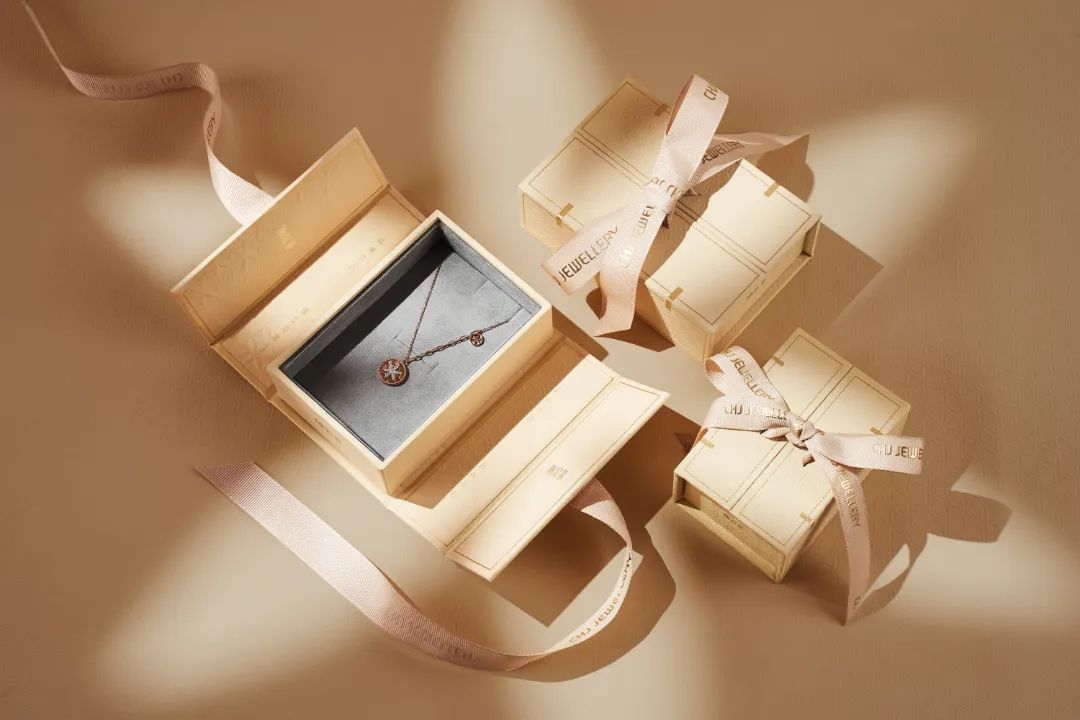 潮宏基“东方妆奁”首饰盒,外形以古代女子用于装载金银首饰的官皮箱(又名百宝箱)为结构灵感。设计结合中国非物质文化遗产珠宝工艺——花丝镶嵌中传统枣花锦纹样,二者融合在包装设计中,使首饰包装作品不仅具有美观实用的常规属性,更成为一件具有东方哲思意味的美学设计。