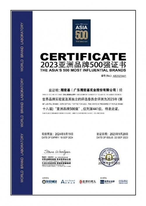 由世界品牌实验室(World Brand Lab)主办的“亚洲品牌大会”于9月20日在香港召开。会上发布了2023年《亚洲品牌500强》排行榜,这份基于品牌亚洲领导力、市场占有率、品牌忠诚度评选的年度榜单,共有20个国家和地区的500个品牌入选。潮宏基珠宝与海尔、三星、腾讯、本田、中国人寿、索尼和中国石油等品牌一同跻身亚洲品牌五百强。