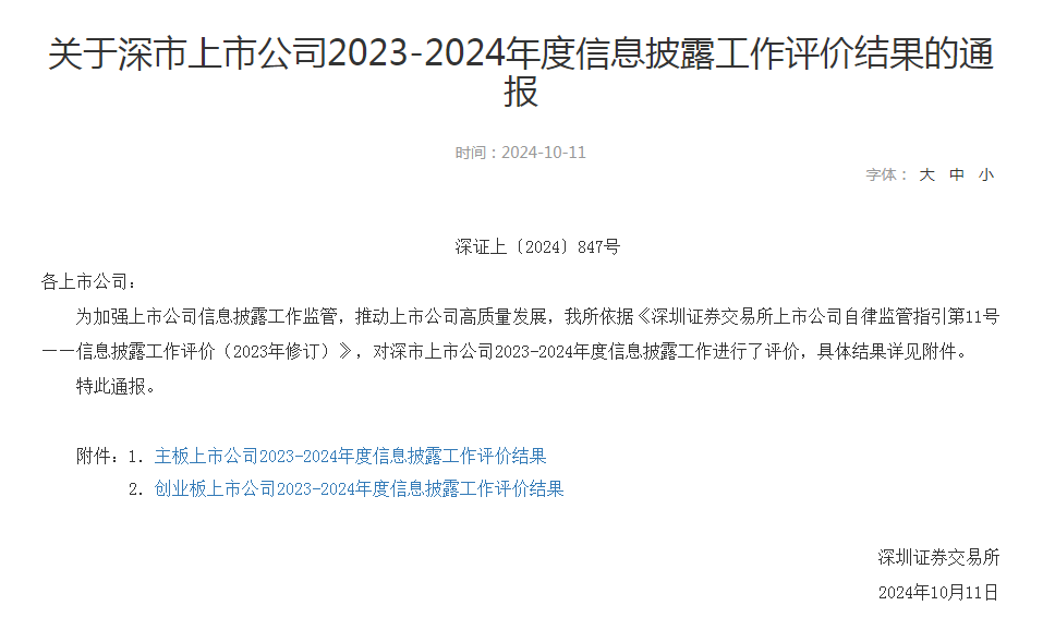 近日,深圳证券交易所发布了《关于深市主板上市公司2023-2024年度信息披露工作评价结果的通报》,潮宏基(002345.SZ)在2023-2024年度上市公司信息披露工作评价中再次荣获最高评级“A”级,这也是公司自2010年上市以来第7次获此殊荣,成功延续了过去六年连续获得信披A级考评的记录。