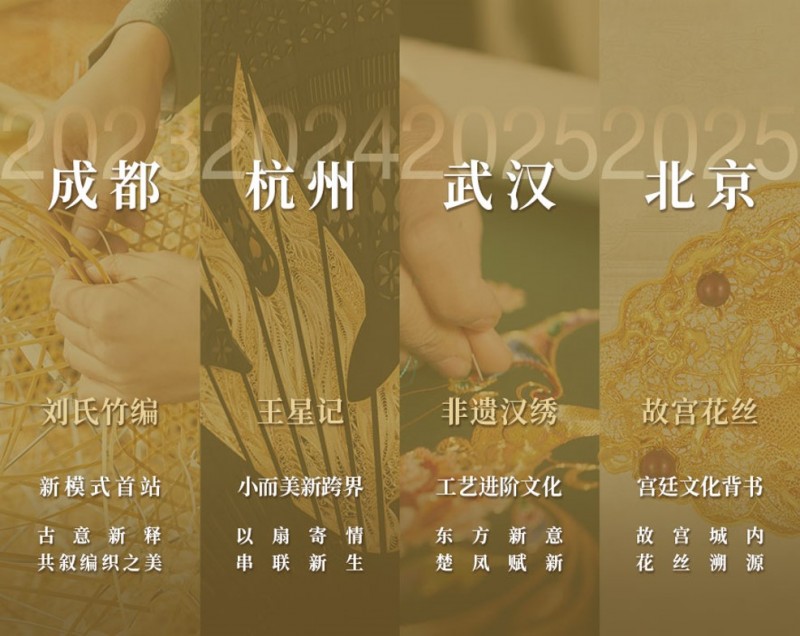 2023年开始,潮宏基发起“一城一非遗”项目,用“深文化”做“浅沟通”,与不同城市的在地非遗文化进行交流和对话,聚焦非遗的在地化创新。在成都,花丝×竹编织就蜀地灵韵、在杭州,花丝×杭扇流转江南风骨、在武汉,花丝×汉绣焕活荆楚纹样、在北京,回溯花丝镶嵌技艺的“来时路”......
