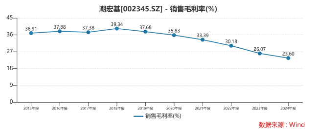也需要注意,一方面,由于近年加盟门店占比的持续提升以及克重黄金产品占比的提升,致使公司整体毛利率持续下降,由2018年创下历史新高的39.34%,自2019年起连续六年下跌至2024年的23.6%;另一方面,珠宝门店的扩张并不一定拉动产品销量的同步增长。2024年,潮宏基珠宝销量同比下跌7.59%,为此公司通过融合东方文化元素,加大产品创新推出高工费、高附加值的黄金产品,推出一口价黄金产品等,一定程度推动公司传统黄金产品的收入上升。