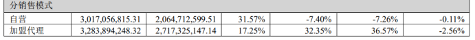 年报显示,2024年,来自加盟代理贡献的收入达到32.84亿元,同比增长32.35%,其收入创下历史新高,然而该销售模式下的毛利率却持续走低,由2020年的23.97%逐年下滑至2024年的17.25%,且远低于自营模式下31.57%的毛利率。