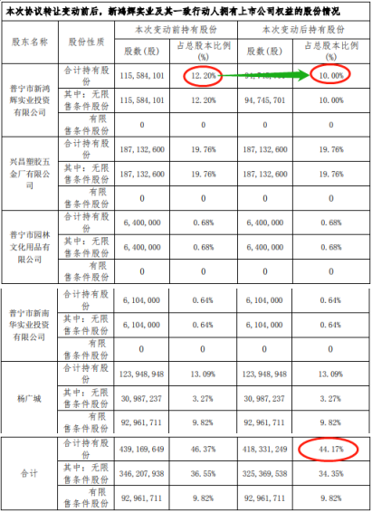 本次权益变动后,杨广城、新鸿辉实业及一致行动人对高乐股份的合计持股比例仍然高达44.17%。