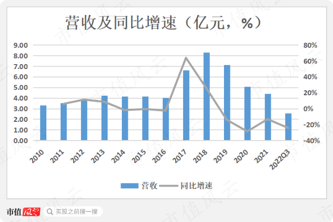 2010-2016年公司营收一直不温不火,规模从3.3亿小幅增长至4亿,CAGR仅3%。