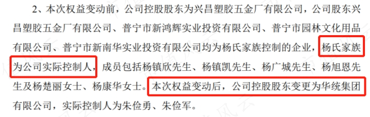 控股股东杨氏家族拟将14%股权转让给华统集团,转让价2.187元/股,作价2.9亿。此外,杨氏家族将其剩余7.74%的表决权全权委托给华统集团。
