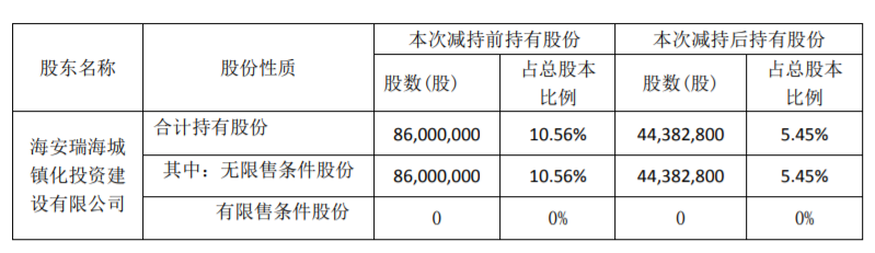精华制药集团股份有限公司12月3日发布的关于持股5%以上股东权益变动的提示性公告显示,精华制药集团股份有限公司近日接到本公司持股5%以上的股东海安瑞海城镇化投资建设有限公司的《简式权益变动报告书》,获悉自2022年6月2日至2022年11月21日期间,海安瑞海通过证券交易所的集中竞价交易减持公司股份累计1628.36万股,减持比例为公司总股本的1.999%;2022年7月27日至2022年12月1日期间,海安瑞海通过证券交易所的大宗交易减持公司股份累计2533.36万股,减持比例为公司总股本的3.112%%,合计减持比例为5.112%。