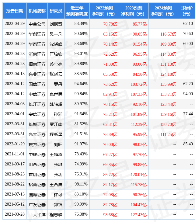 证券之星数据中心根据近三年发布的研报数据计算,招商证券(600999)王西典研究员团队对该股研究较为深入,近三年预测准确度均值高达98.11%,其预测2022年度归属净利润为盈利82.17亿,根据现价换算的预测PE为28.5。