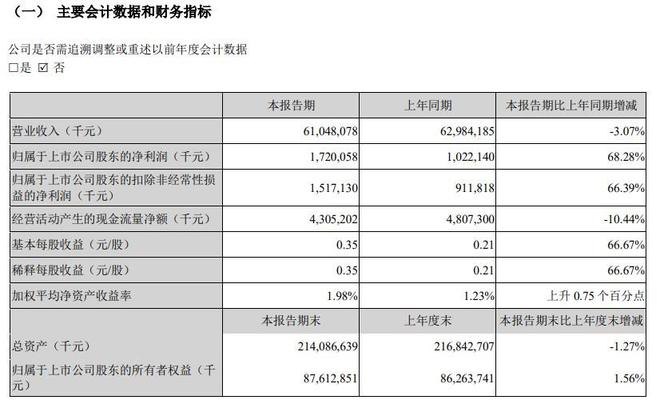 归属净利润17.20 亿元,同比增长 68.28%;扣非净利润15.17亿元,同比增长66.39%。