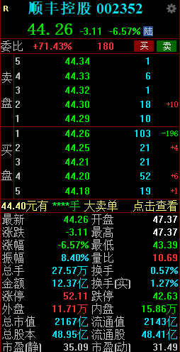 6月29日消息,快递龙头顺丰控股盘中一度放量大跌8%,截至发稿,股价报44.26元,创出近15个月新低,最新市值2167亿元。